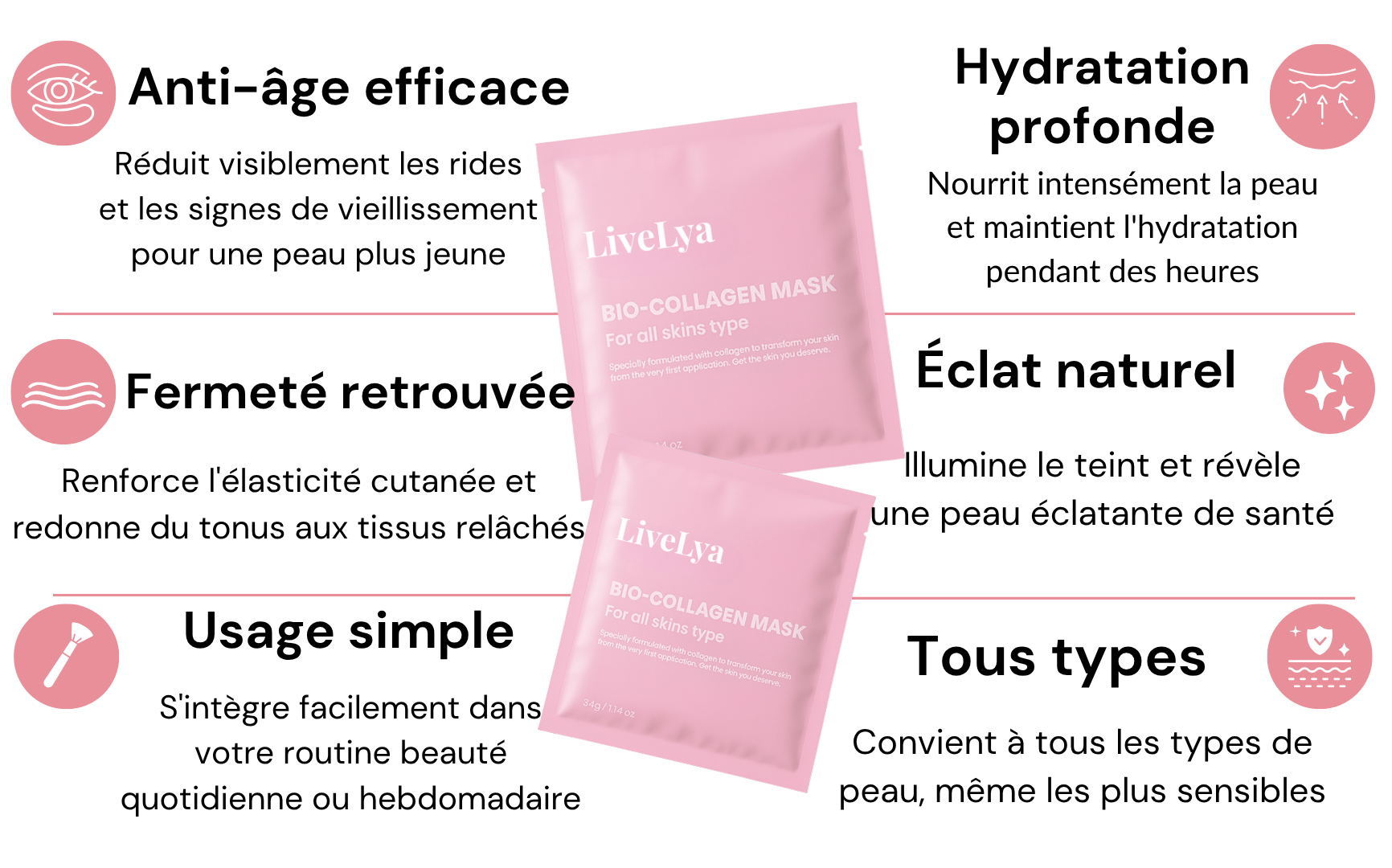« Avec l'âge, la peau se déshydrate et le collagène s’amenuise, laissant apparaître ridules et perte de fermeté. Le Masque Coréen au Collagène LiveLya agit spécifiquement la nuit : il hydrate la peau, stimule la production naturelle de collagène et lisse visiblement les rides naissantes. Sa technologie coréenne redonne élasticité et éclat au visage, pour une peau plus fraîche et rebondie dès le réveil. »